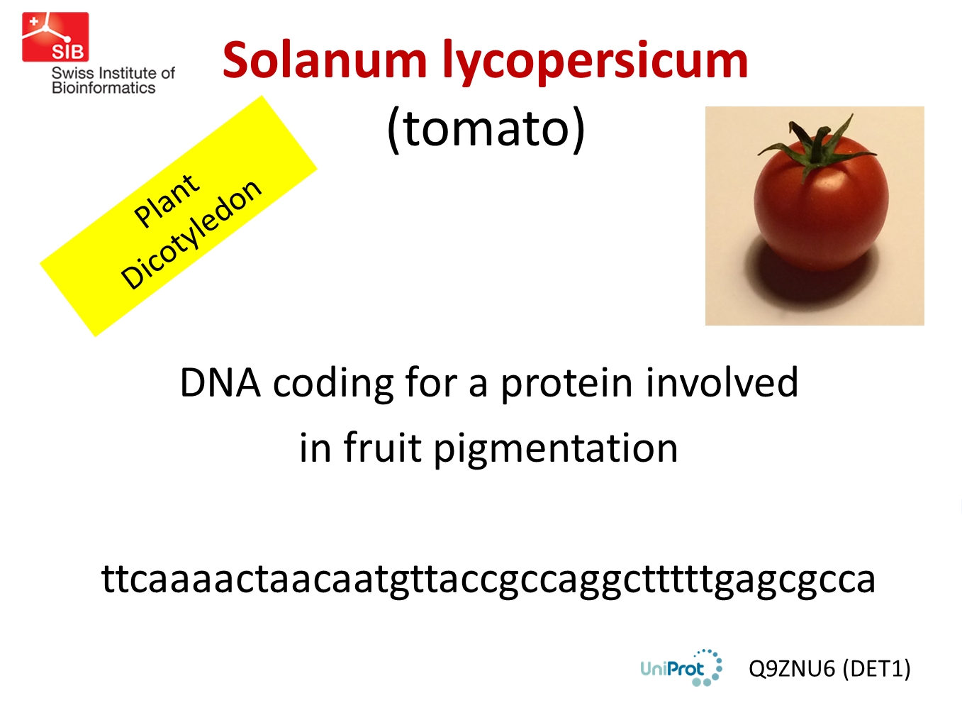 The DNA read (ttcaaaactaacaatgttaccgccaggctttttgagcgcca) is from a tomato (Solanum lycopersicum), and encodes a protein involved in fruit pigmentation. A link to the accession number of the corresponding entry in UniProtKB/Swiss-Prot is provided (Q9ZNU6), as well as the name of the taxonomic group to which the organism belongs (Dicotyledon Plant).